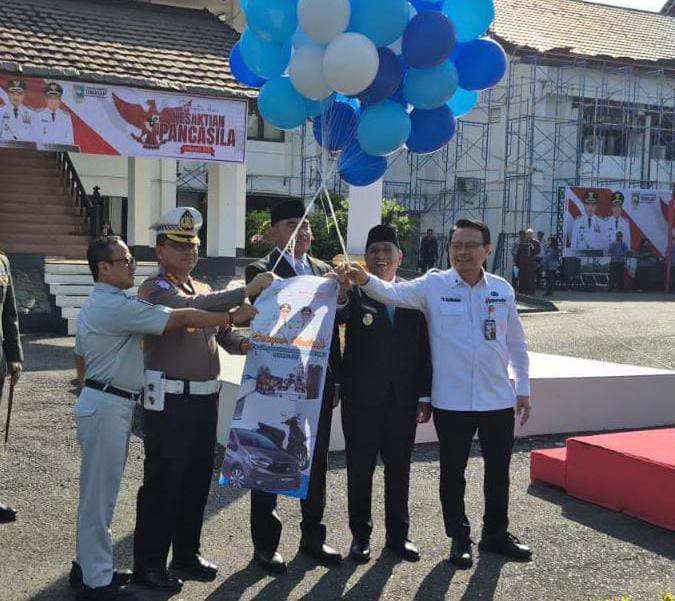 PELAIHARI, POSTKALIMANTAN.com – Suasana meriah mewarnai peluncuran Gebyar Panutan Pajak Kendaraan Bermotor 2025 yang digelar di Lapangan A. Syairani, Pelaihari, Rabu (1/10/2025). Acara ditandai dengan pelepasan balon ke udara oleh Bupati Tanah Laut H. Rahmat Trianto bersama Wakil Bupati, Dirlantas Polda Kalsel Kombes Pol Dr. M. Fahri Siregar, dan Kepala Bapenda Kalsel Subhan Nor Yaumil.