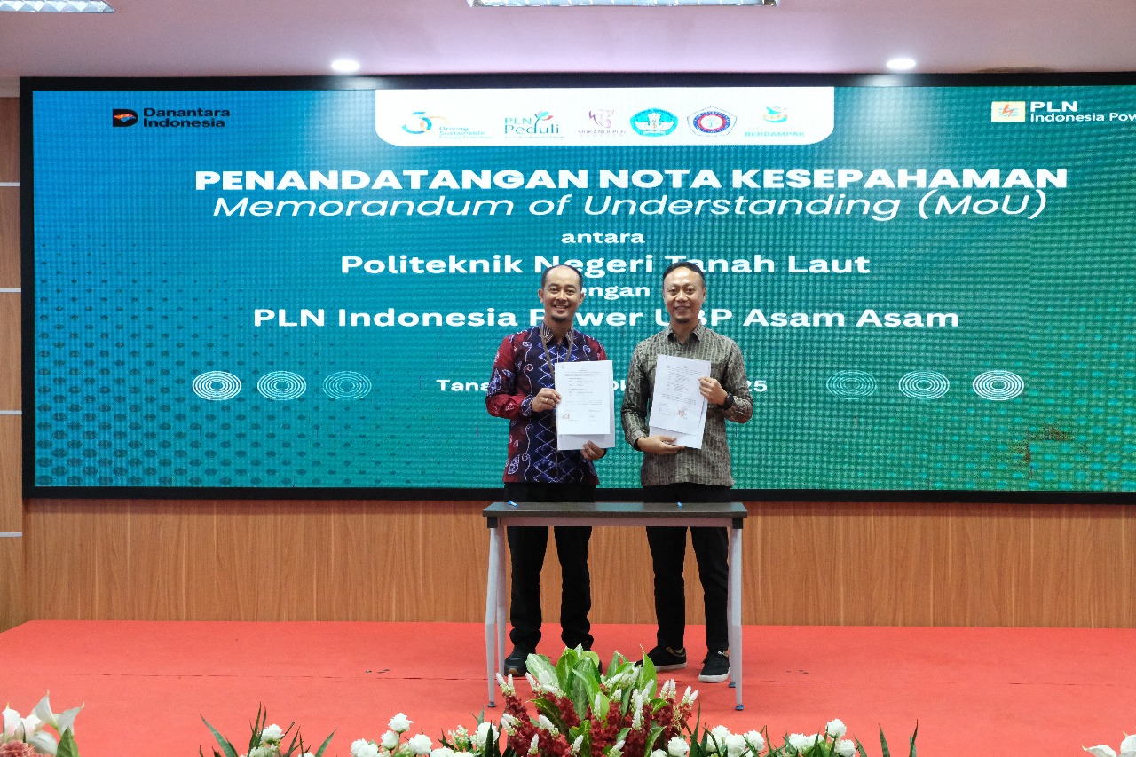 Penandatanganan MoU dilakukan oleh Dr. Ir. Meldayanoor, S.Hut., M.S., Direktur Politeknik Negeri Tanah Laut, bersama Reo Yanuar Hadi, Senior Manager PLN Indonesia Power UBP Asam Asam.