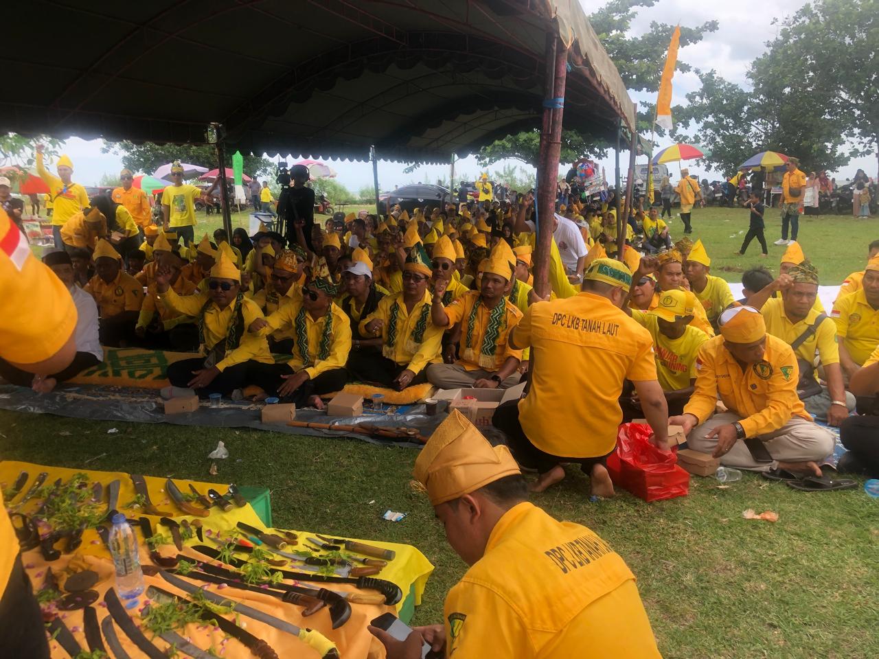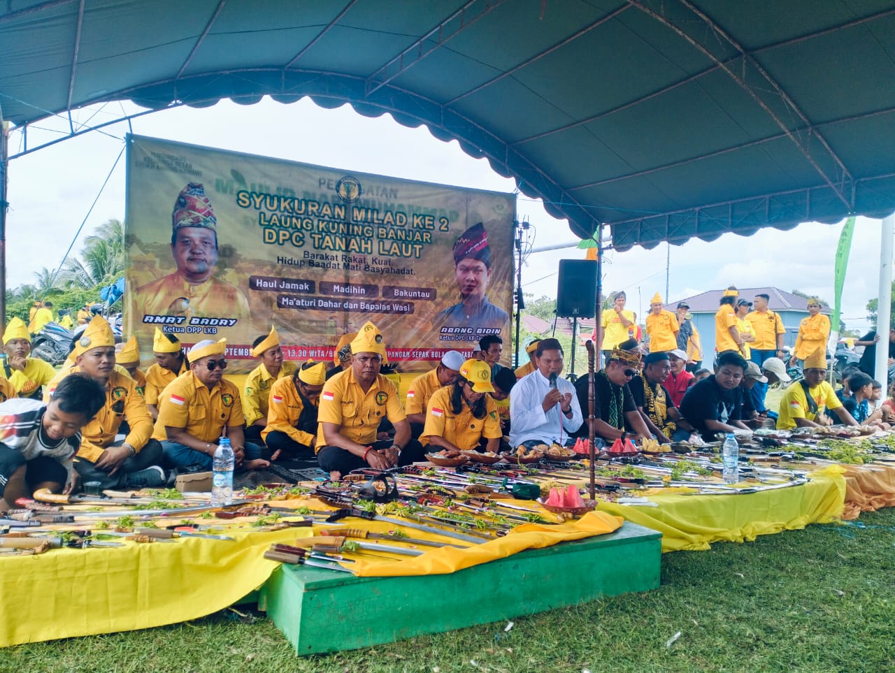 TANAH LAUT, POSTKALIMANTAN.com – Ratusan anggota Laung Kuning Banjar (LKB) dari berbagai daerah tumplek ruah di Lapangan Sepak Bola Desa Tabanio, Kecamatan Takisung, Kabupaten Tanah Laut, Provinsi Kalimantan Selatan, Minggu (14/9/2025). Peringatan Milad ke-2 DPC LKB Tanah Laut ini dikemas dalam suasana penuh kekeluargaan dengan acara tasyakuran, Ma’aturi Dahar serta tradisi Bapalas Wasi.