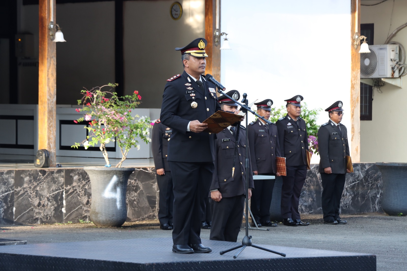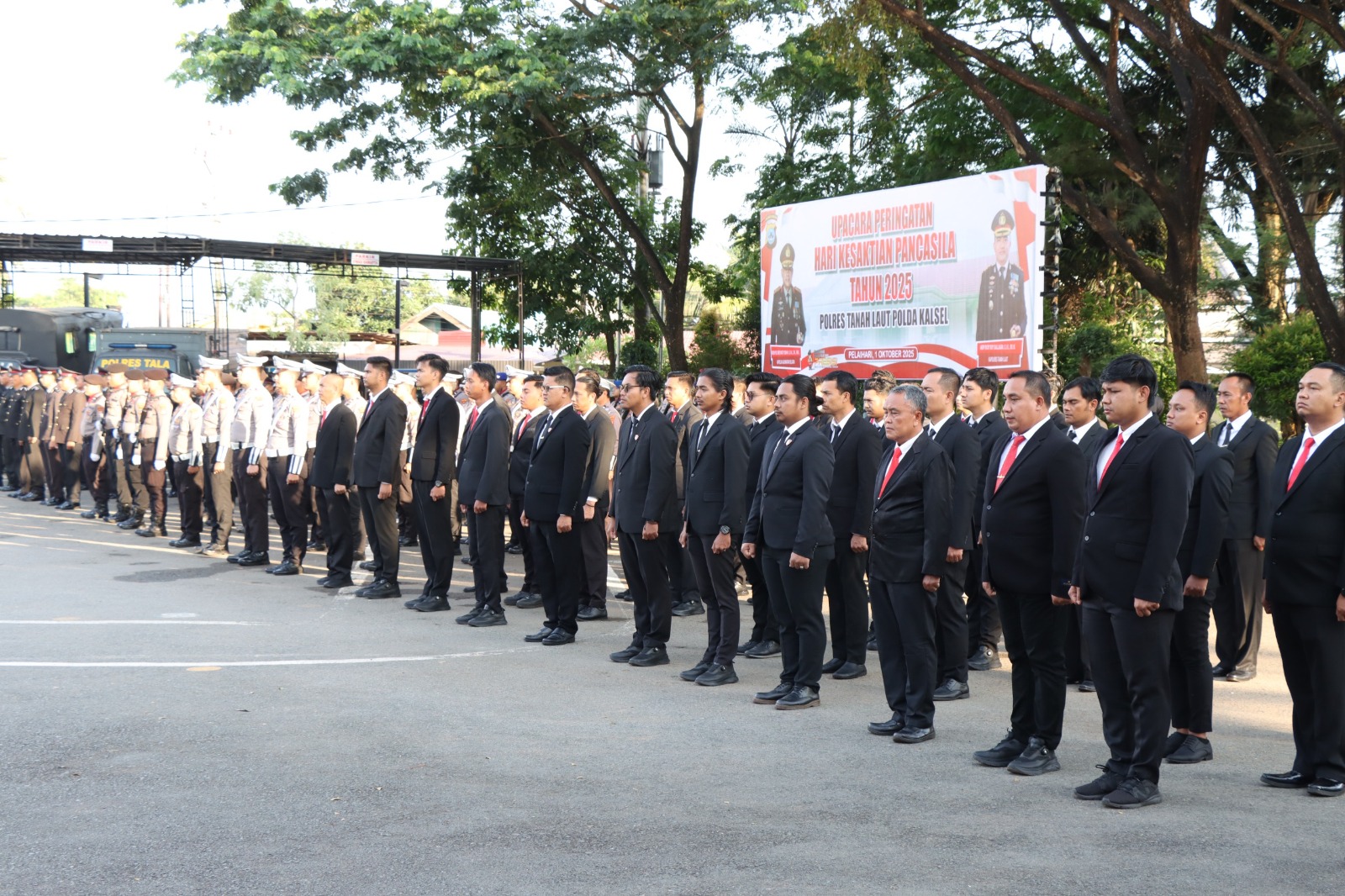 Kapolres Tanah Laut, AKBP Ricky Boy Siallagan, S.I.K., M.I.K., memimpin langsung upacara sebagai inspektur. Turut mendampingi Wakapolres Kompol Andri Hutagalung, S.Ab., M.A.P., bersama para pejabat utama Polres Tala.