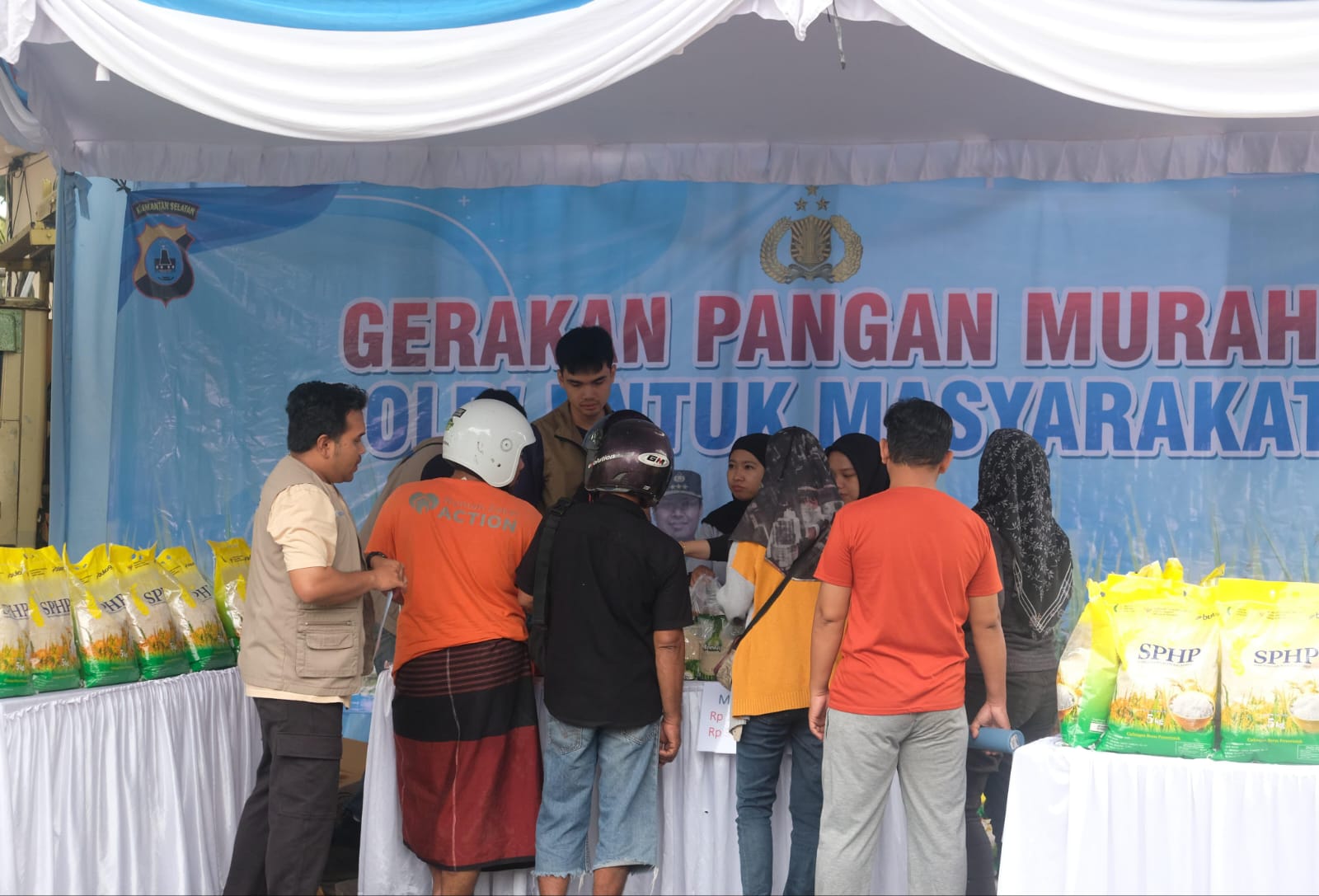 Petugas dari Ditreskrimsus Polda Kalsel bersama Bulog Kalsel tampak sigap melayani pembeli agar transaksi berlangsung tertib dan cepat.