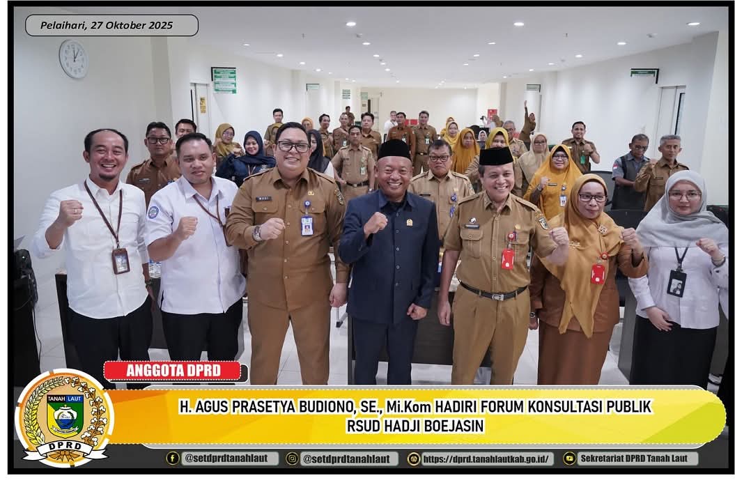 PELAIHARI, POSTKALIMANTAN.com – Upaya meningkatkan kualitas pelayanan publik terus digencarkan oleh RSUD Hadji Boejasin Tanah Laut. Rumah sakit kebanggaan warga Tala ini menggelar Forum Konsultasi Publik (FKP) pada Senin (27/10/2025), yang turut dihadiri Ketua Komisi II DPRD Tanah Laut dari Fraksi Golkar, H. Agus Prasetya, SE, M.I.Kom.